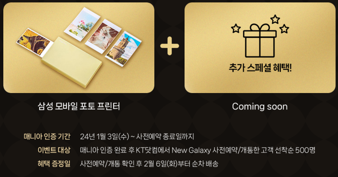 또한, KT에서 갤럭시 시리즈를 4회 이상 개통한 고객 대상 삼성 모바일 포토 프린터 증정 혜택이 있었는데요. 몇 년간 KT를 이용하는 고객이라면 해당 이벤트 내용에 해당이 될 가능성이 매우 높습니다.