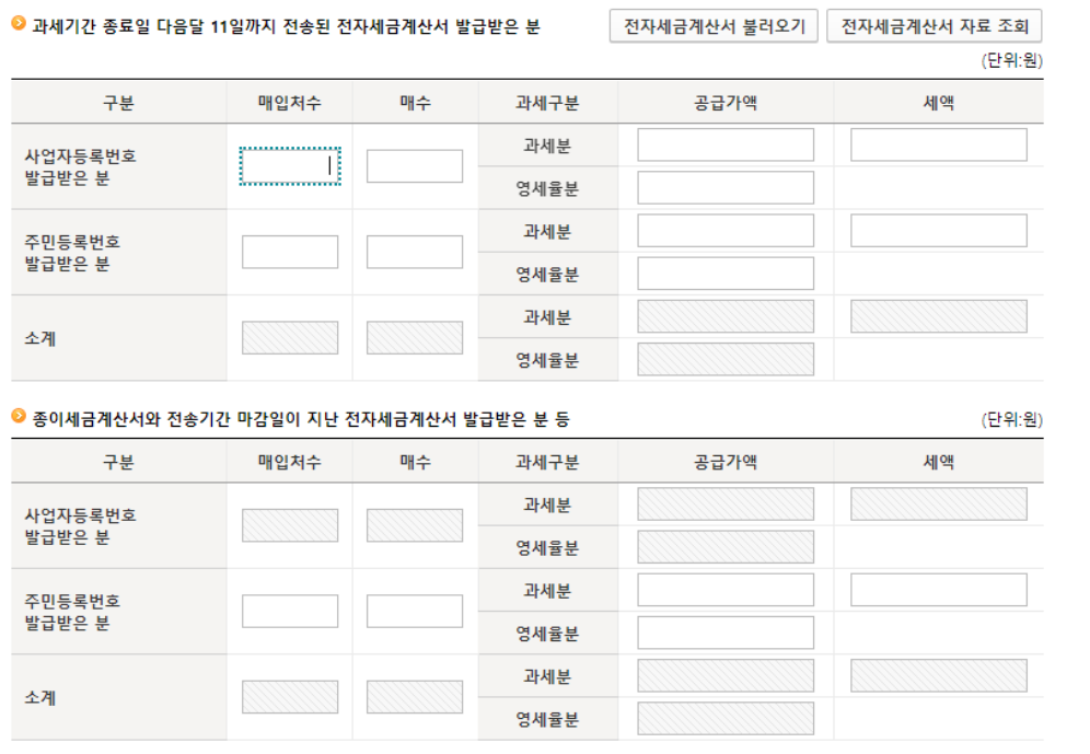 6️⃣ 여기 포스팅 글의 하단 부분에 전자세금계산서에 해당하는 간이과세자 사업자 분들의 수익 기준을 확인하시고, 해당사항이 있다면 매입처수, 매수를 입력하시고 공급가액까지 입력해 주시면 자동으로 세액이 계산이 됩니다.