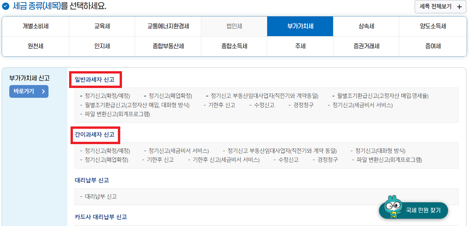 3️⃣세금신고 메뉴탭에 들어가셔서 스크롤을 아래를 내리면 "부가가치세"가 나옵니다.