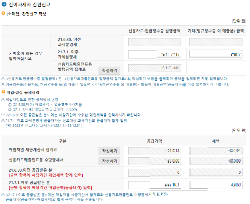 7️⃣그리고 다음 단계로 넘어가시면 다시 한번 간이과세자 간편 신고 내용과 매입 경감 공제세액을 한눈에 볼 수 있는 표들이 계속 나옵니다. (꼼꼼하게 내가 기입한 금액이 잘 맞는지 확인!)