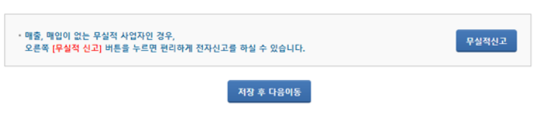 만약 내가 사정이 생겨 사업자만 있고, 따로 매출이 전혀 없어 0원이시라면 간단하게 위의 사진처럼 자신의 사업자 업종을 선택하시고 "무실적신고"를 하시면 간편하게 신고를 마칠 수 있습니다.