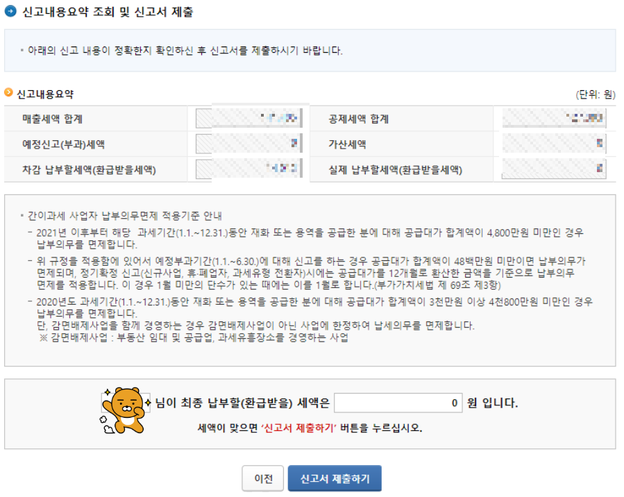 간이과세자라고 해서 납부 면제가 가능하나 위의 방법대로 부가가치세 신고를 하지 않을 경우 나중에 가산세가 붙을 수 있기 때문에 큰일이 난다고 합니다. 꼭 확인하셔서 1월 25일까지 부가세 신고를 제대로 마치시길 바랍니다.