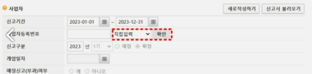 홈택스에서 공동인증서로 로그인을 했을 경우, 나의 사업자 번호가 저장되어 있을 것입니다. 위의 사진에서 보듯이 사업자 등록번호 옆에 "직접입력" 옆 화살표를 누르시면 나의 사업자 번호가 자동으로 입력이 가능합니다.