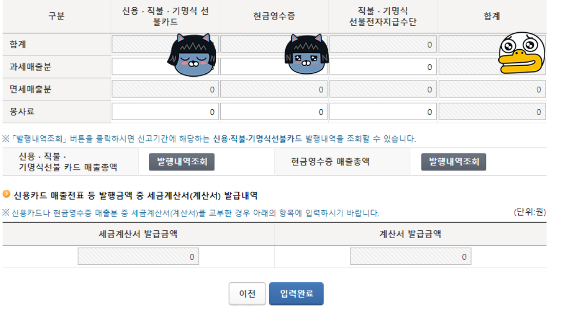 5️⃣사진 하단의 '발행내역조회' 버튼에 접속하시면 신고기간에 해당하는 결제수단 발행내역에 대해 조회에 가능합니다. 나의 사업자 매출전표를 확인하시고 현금영수증, 결제 카드에 대한 금액을 입력하시면 됩니다.